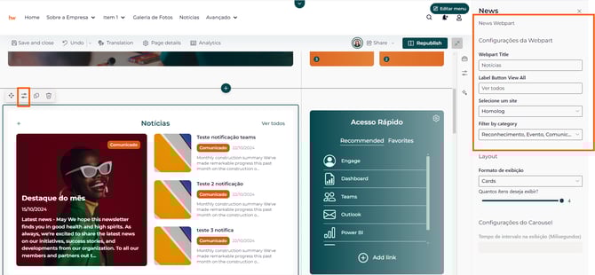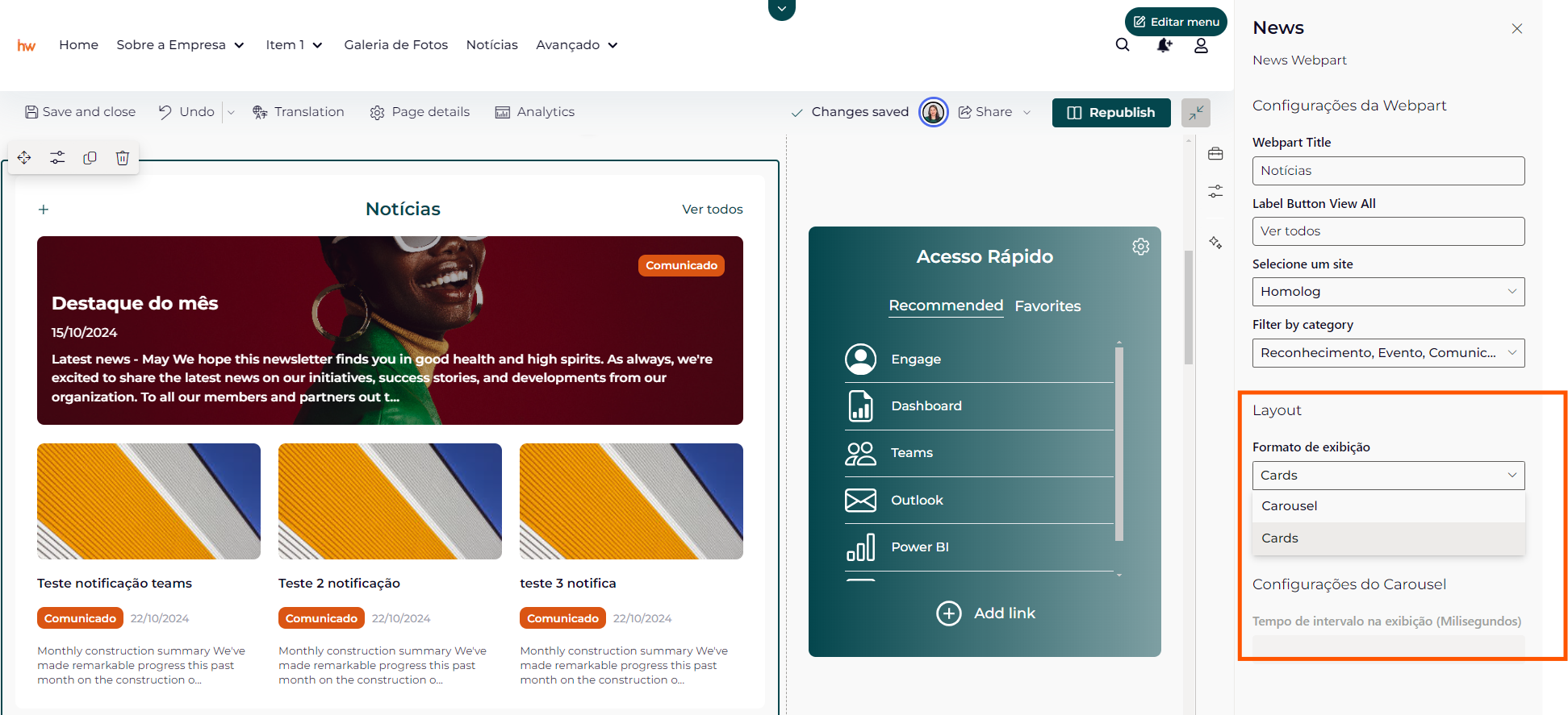 1- Você pode definir o layout do bloco de notícias em formato de cards ou carrosel