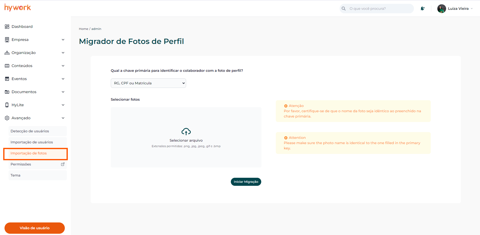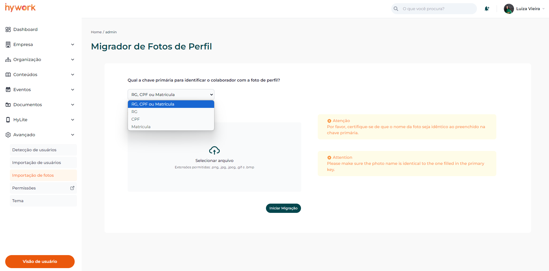 2- Selecione a chave primária que você deseja utilizar para relacionar o nome da foto com o colaborador cadastrado na intranet, como CPF, Matrícula ou RG.
