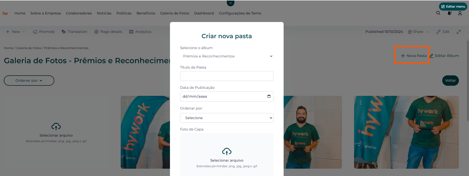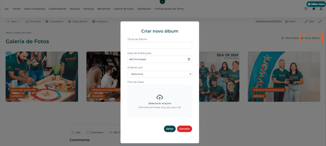 1- Em galeria de fotos, clique em "novo álbum" e preenchas as informações para a criação.