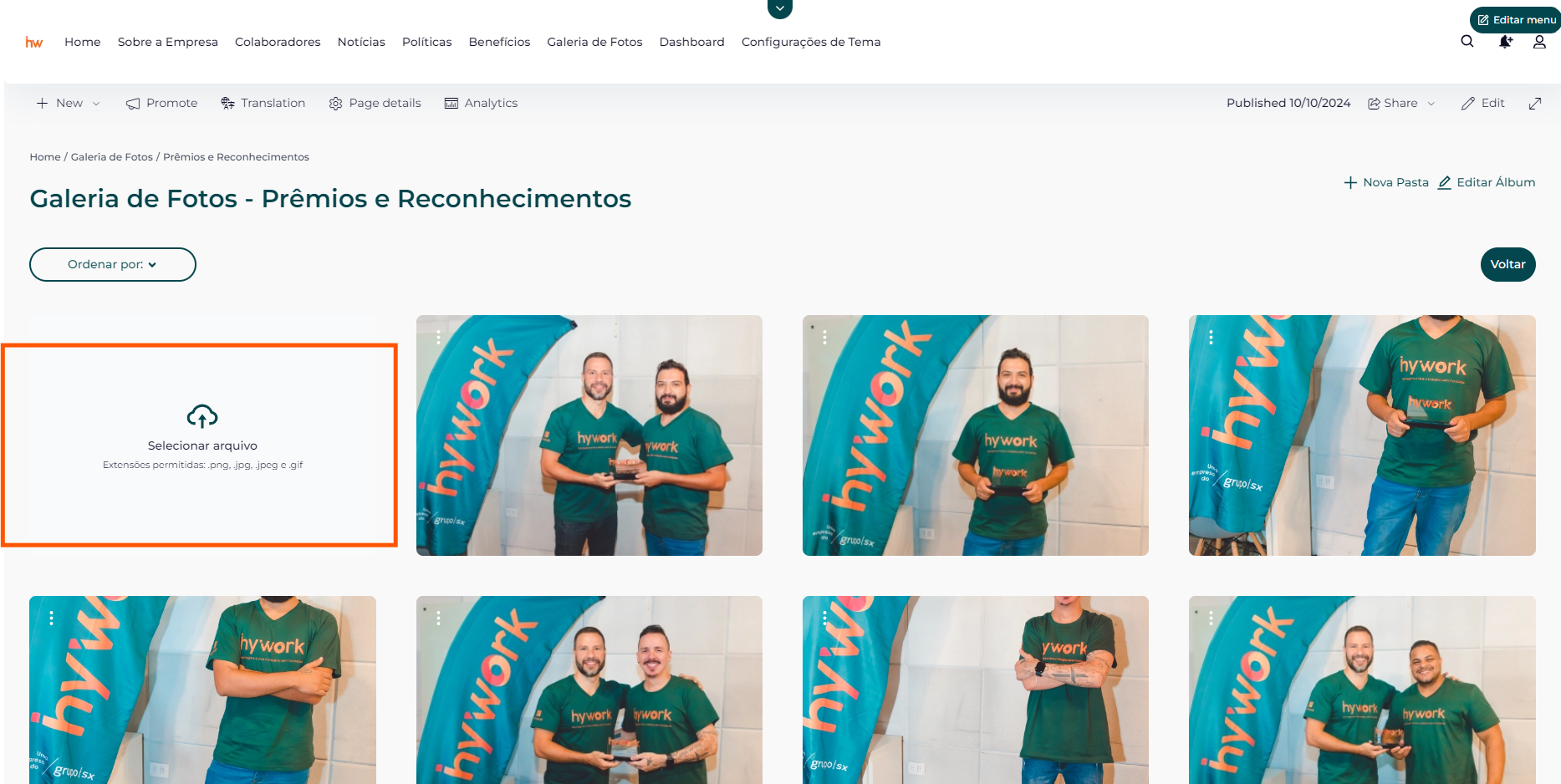 1- Após criar o álbum, clique para realizar o upload das imagens. Você pode adicionar várias fotos de uma única vez.