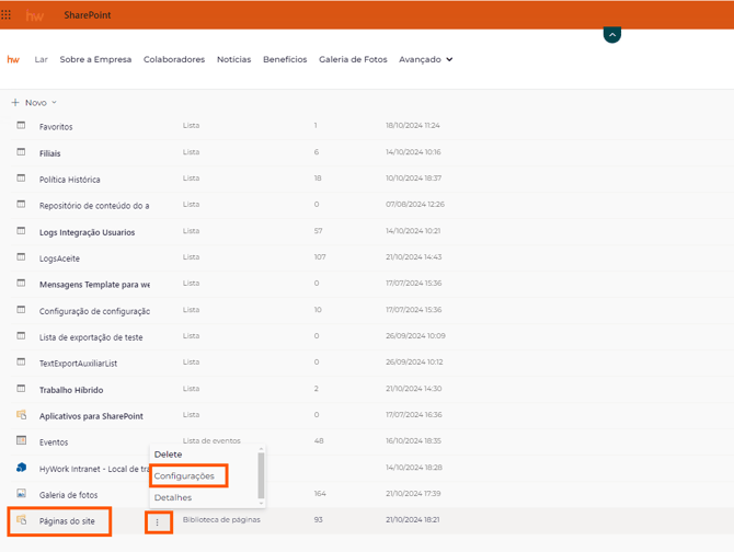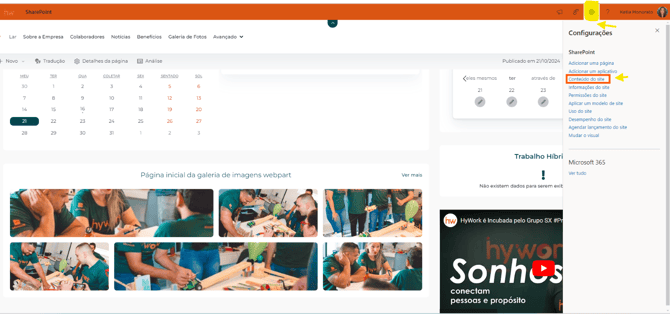 1- Clique na engrenagem no canto superior direito e selecione "Conteúdo do site".