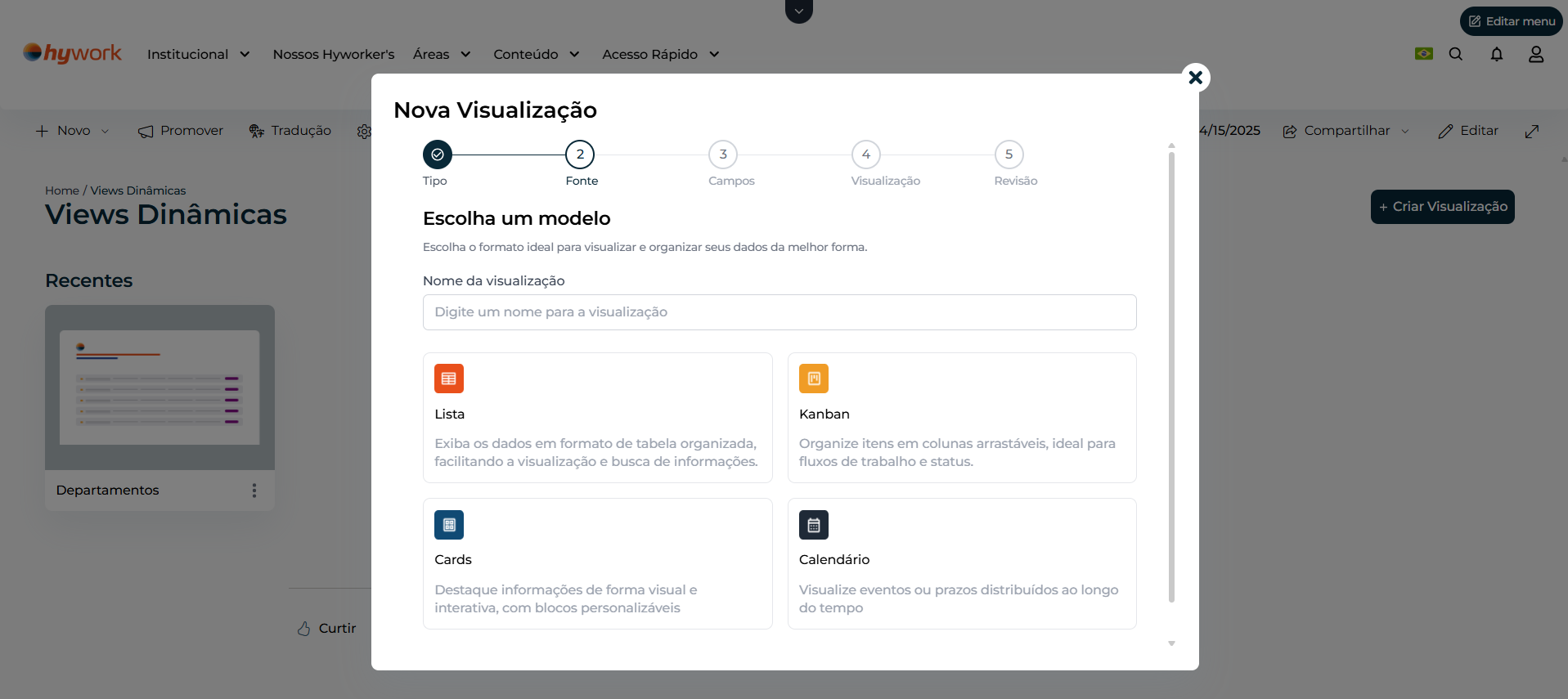 Ao iniciar a criação de uma nova view, você verá uma galeria com os formatos disponíveis. Escolha o layout que melhor atende à sua necessidade: