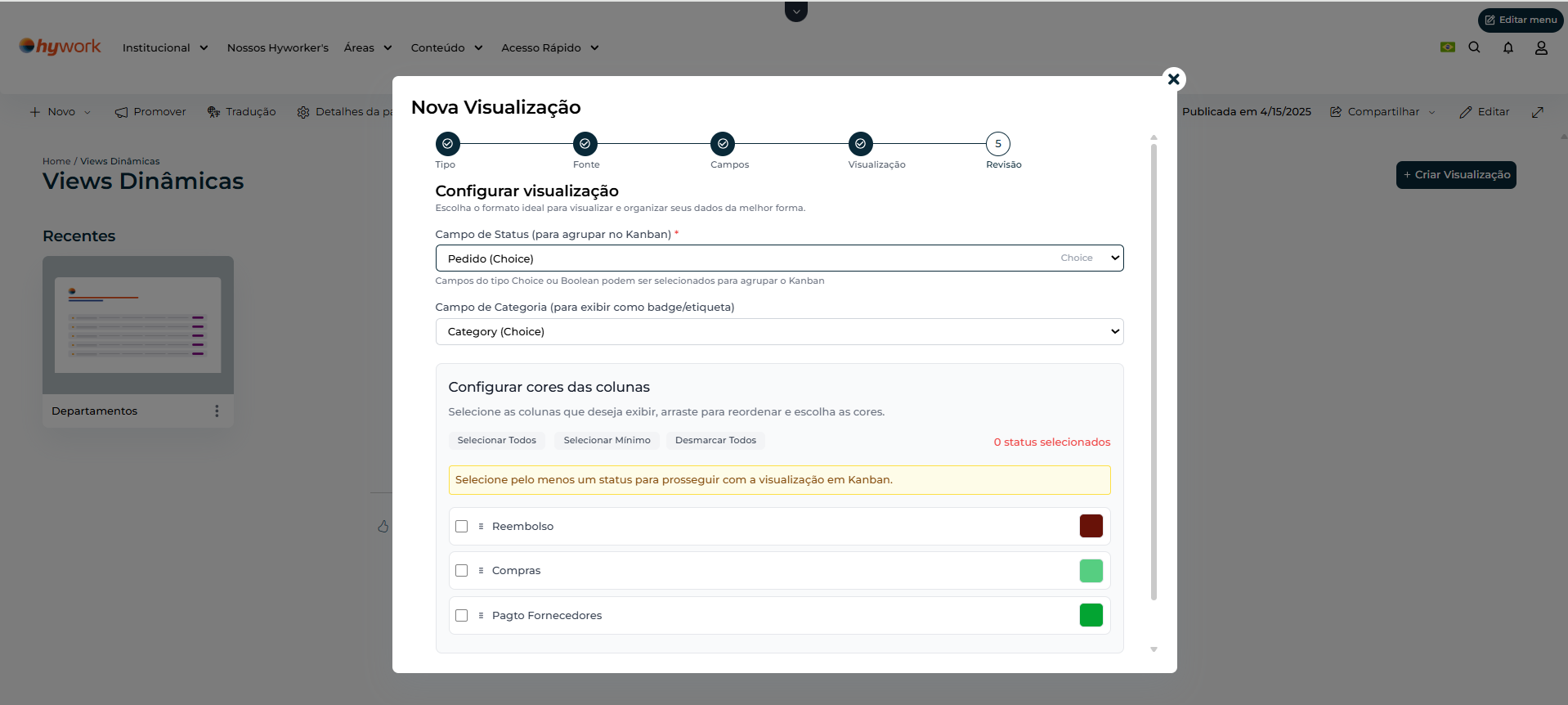 Para alguns tipos de visualizações, como Kanban e Calendário, é necessário personalizar a exibição com base em colunas específicas da sua lista: