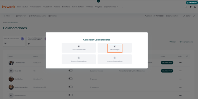 1- Na página de colaboradores, acesse gerenciamento e em seguida selecione editar campos