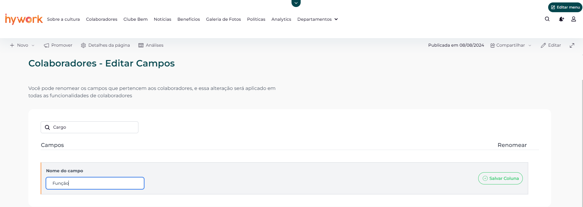 2- Na tela de edição de campos, localize a coluna, modifique o nome conforme sua preferência e salve. Essa alteração será aplicada a todas as colunas relacionadas aos colaboradores.
