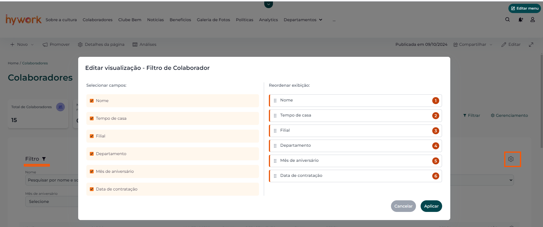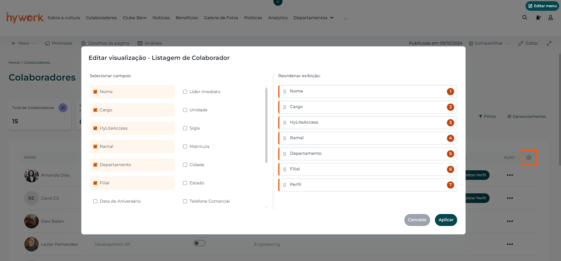 1- Clique no ícone de configurações e, em seguida, selecione a opção para exibir, ocultar ou ordenar os campos que serão disponibilizados na tabela de colaboradores.