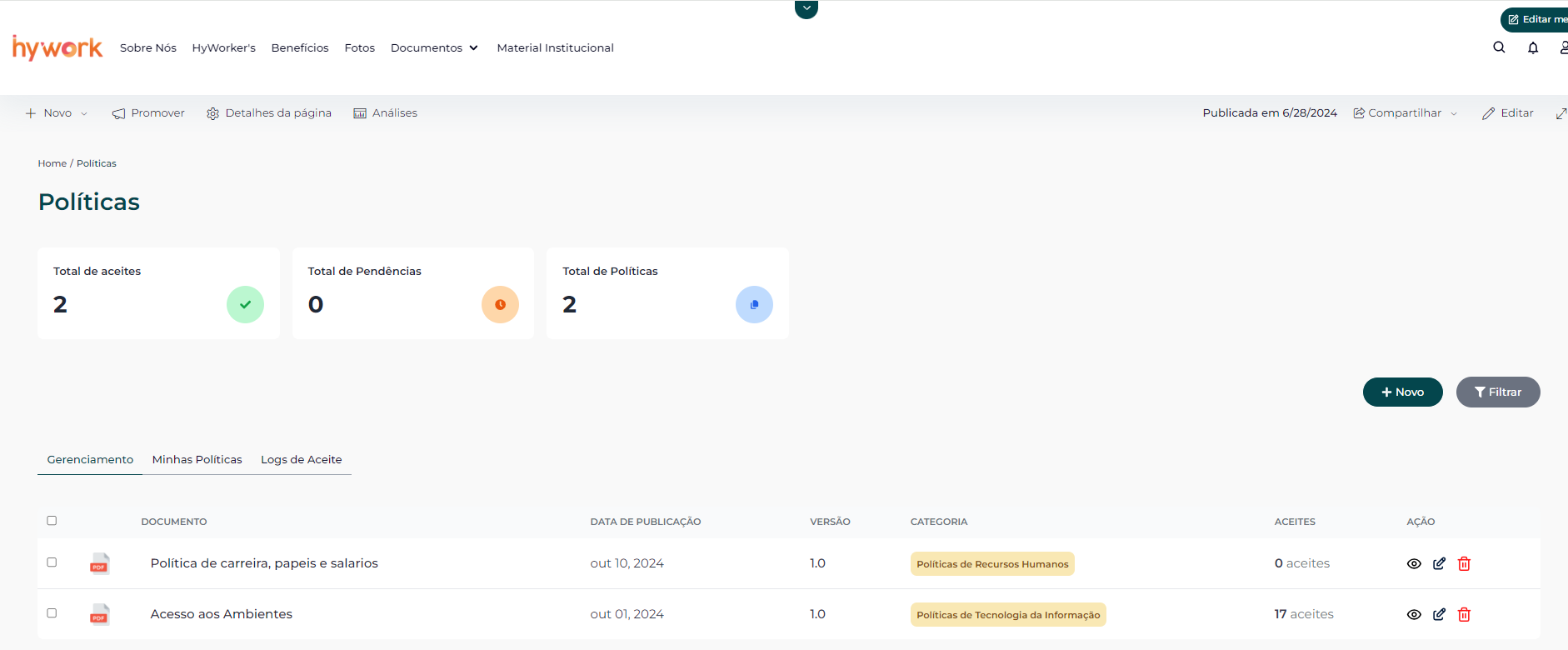 4- Na coluna de "Ação", clique no ícone de olho para visualizar a política com os aceites dos colaboradores.