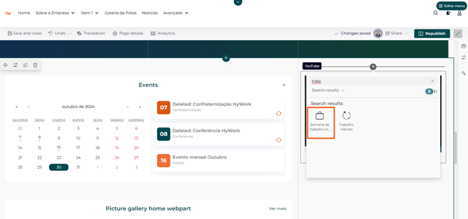 1- Na edição da página inicial, selecione a seção onde deseja incluir a funcionalidade de trabalho híbrido, clique no ícone de "+" e pesquise por Trabalho Híbrido.