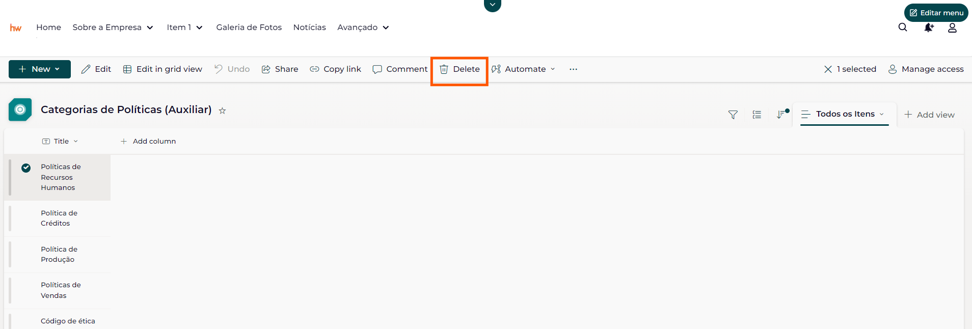 1- Selecione o item que deseja excluir, clique nos 3 pontinhos e, em seguida, clique em Excluir ou Delete.