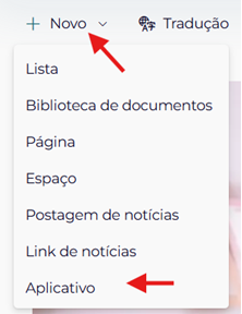 - Na Home da sua intranet, clique em Novo no menu de opções.