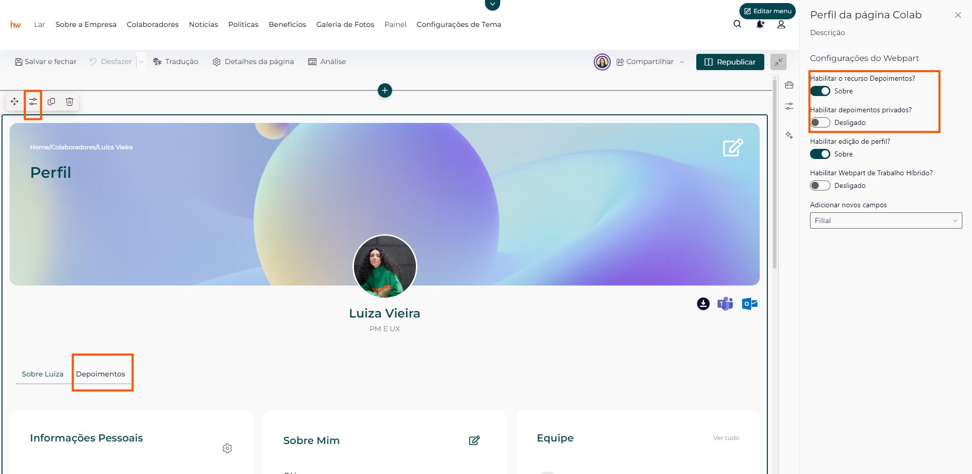 2- Quando desabilitado, os colaboradores poderão ver os depoimentos feitos por outros colaboradores para o proprietário do perfil.