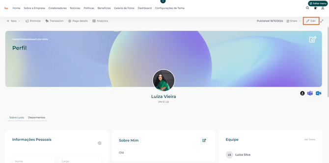 1- Para habiitar o mural de depoimentos no perfil do colaborador, será preciso editar o bloco de conteúdo do perfil, clicando em editar: